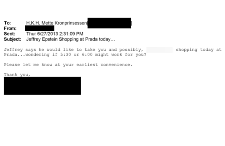 Ifølge en mailutvekslinger og timeplan fra sommeren 2013 planla Epstein å ta med kronprinsessen på shoppingtur til Prada i New York.