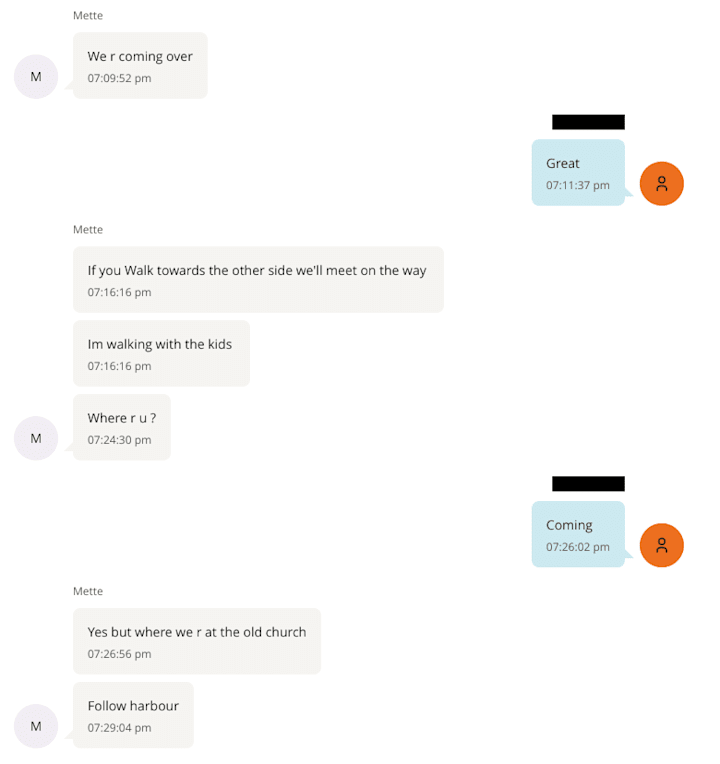 Ifølge en sms-utveksling litt senere i januar 2013 mellom «Mette» og «Jeffrey», avtales det et møte, hvor «Mette» skriver: «Hvis du går mot den andre siden, så møter vi deg på veien. Jeg går sammen med barna.»