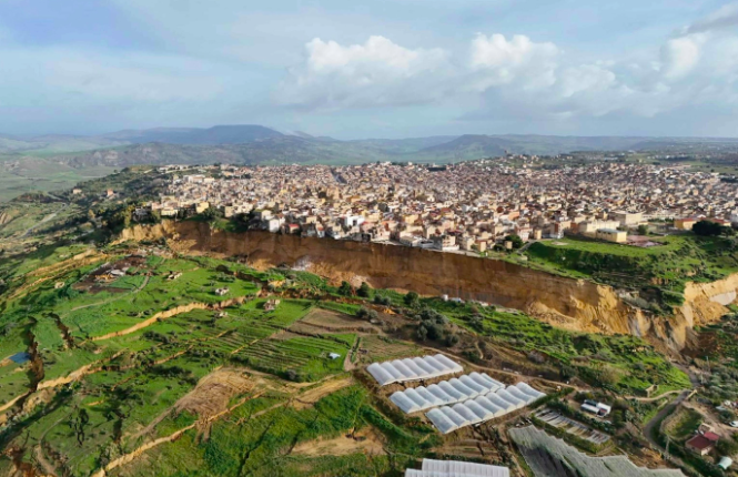 Niscemi ligger oppe på en lav åsrygg, rundt 330 meter over havet, i det indre av det sørøstlige Sicilia. Det var flere dager med ekstremt regn som hadde ført til det fire kilometer store skredet.
